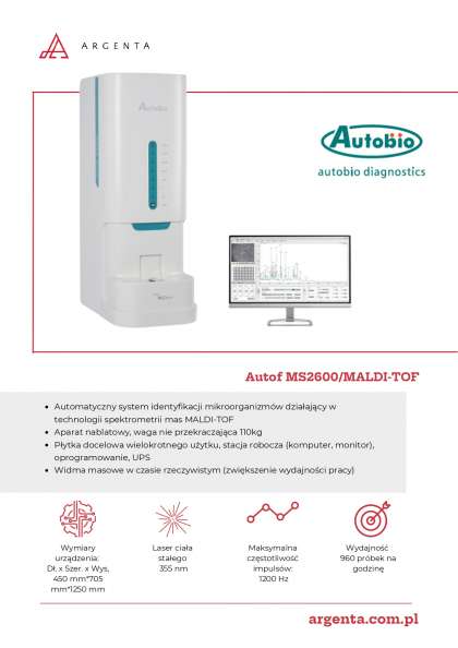 Automatyczny system identyfikacji mikroorganizmów w technologii spektrometrii mas MALDI-TOF, zaprojektowany do szybkiego uzyskiwania widm w czasie rzeczywistym i wysokiej jakości identyfikacji.